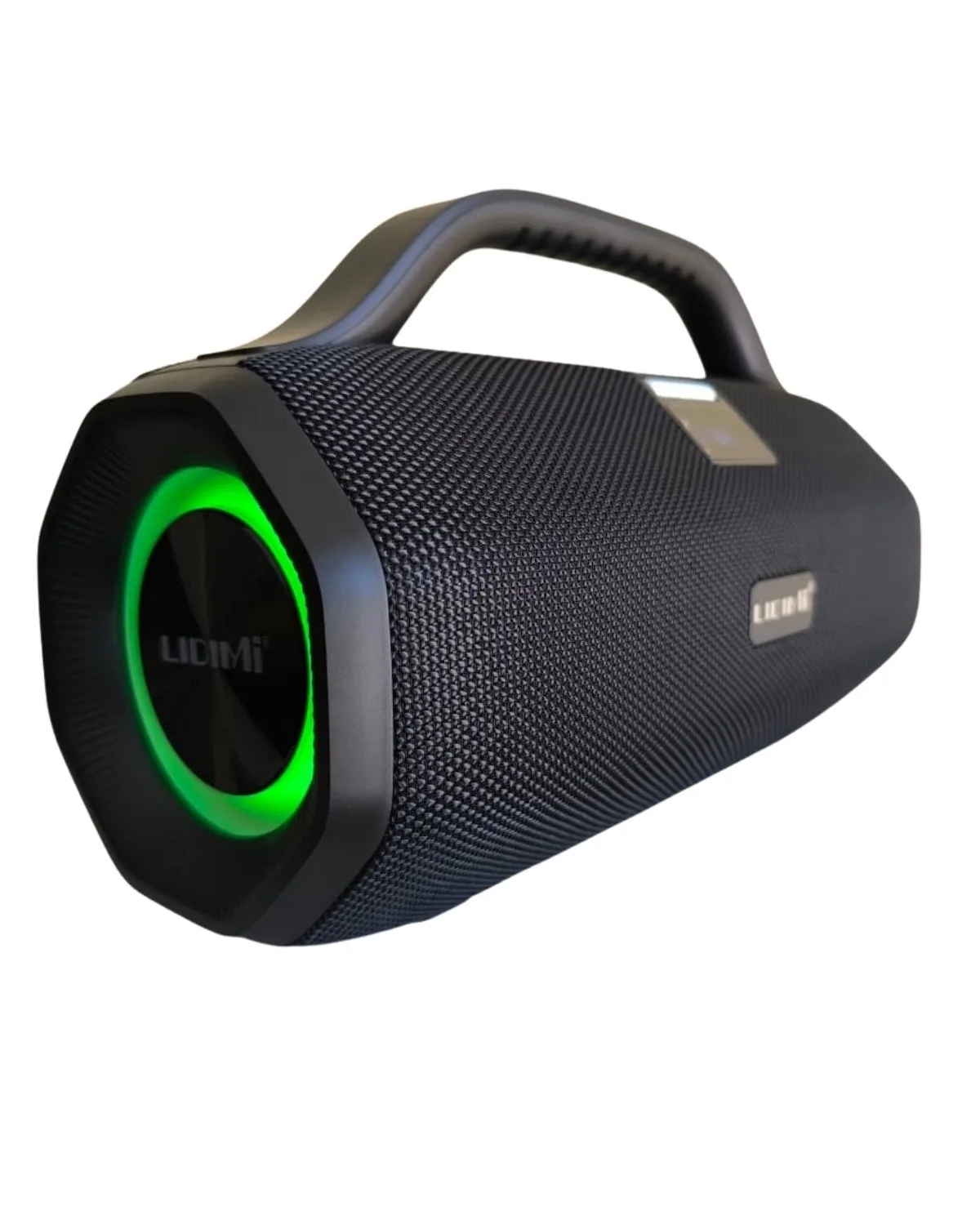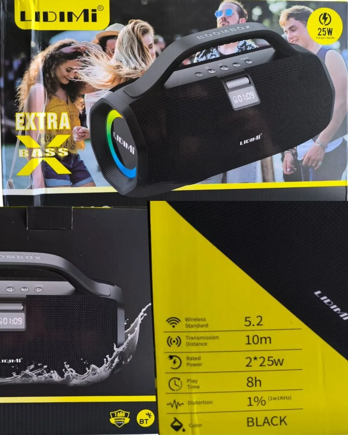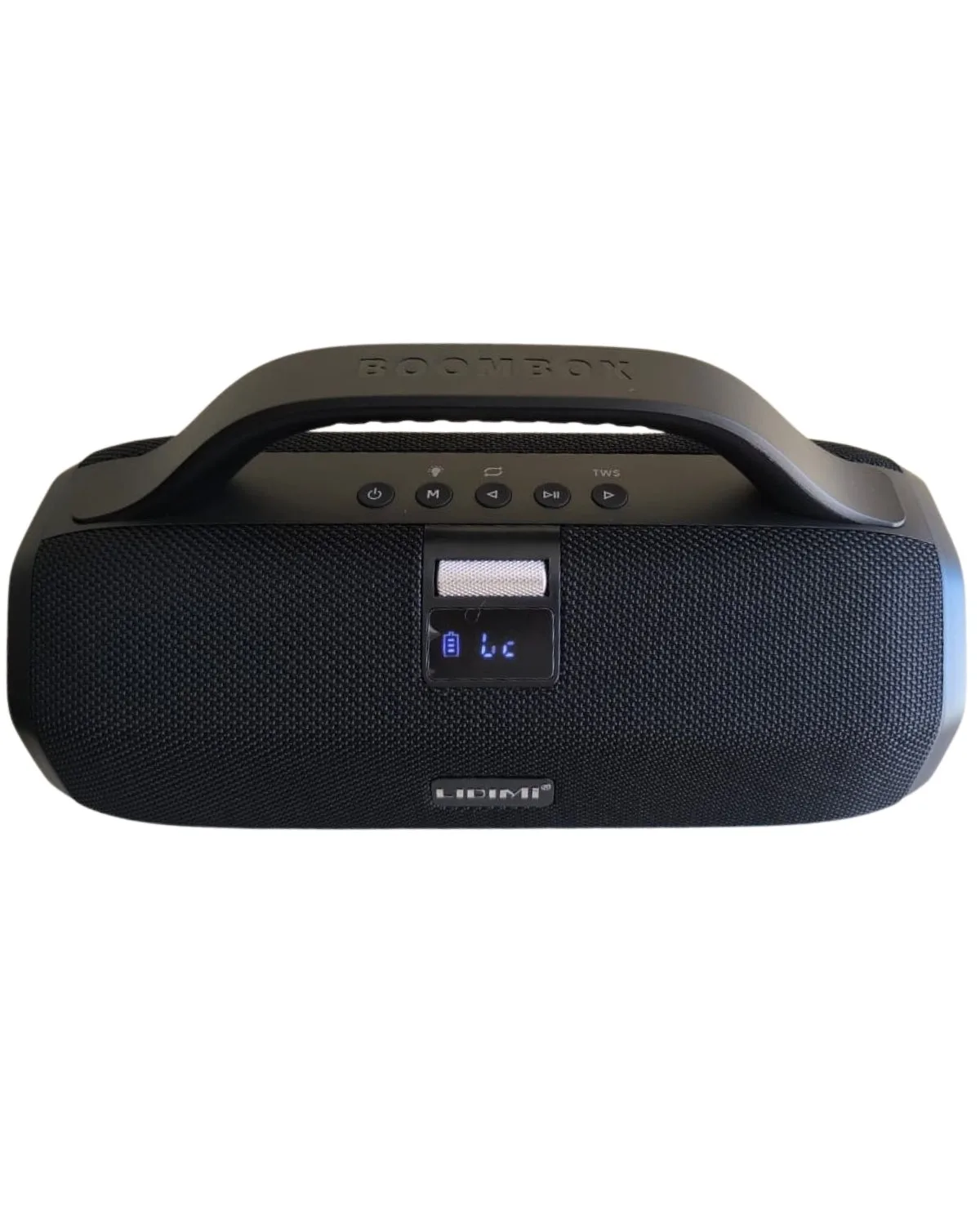 - Diseño portátil boombox – Asa resistente, pantalla LED (muestra hora/modo), cuerpo negro robusto con detalles premium.