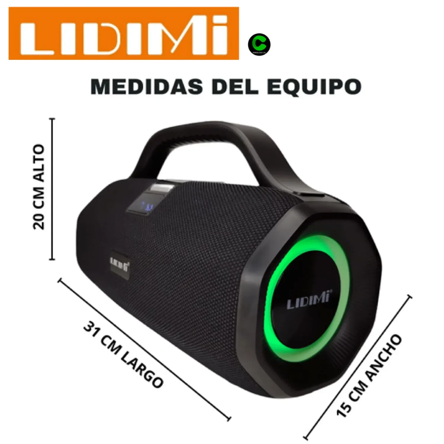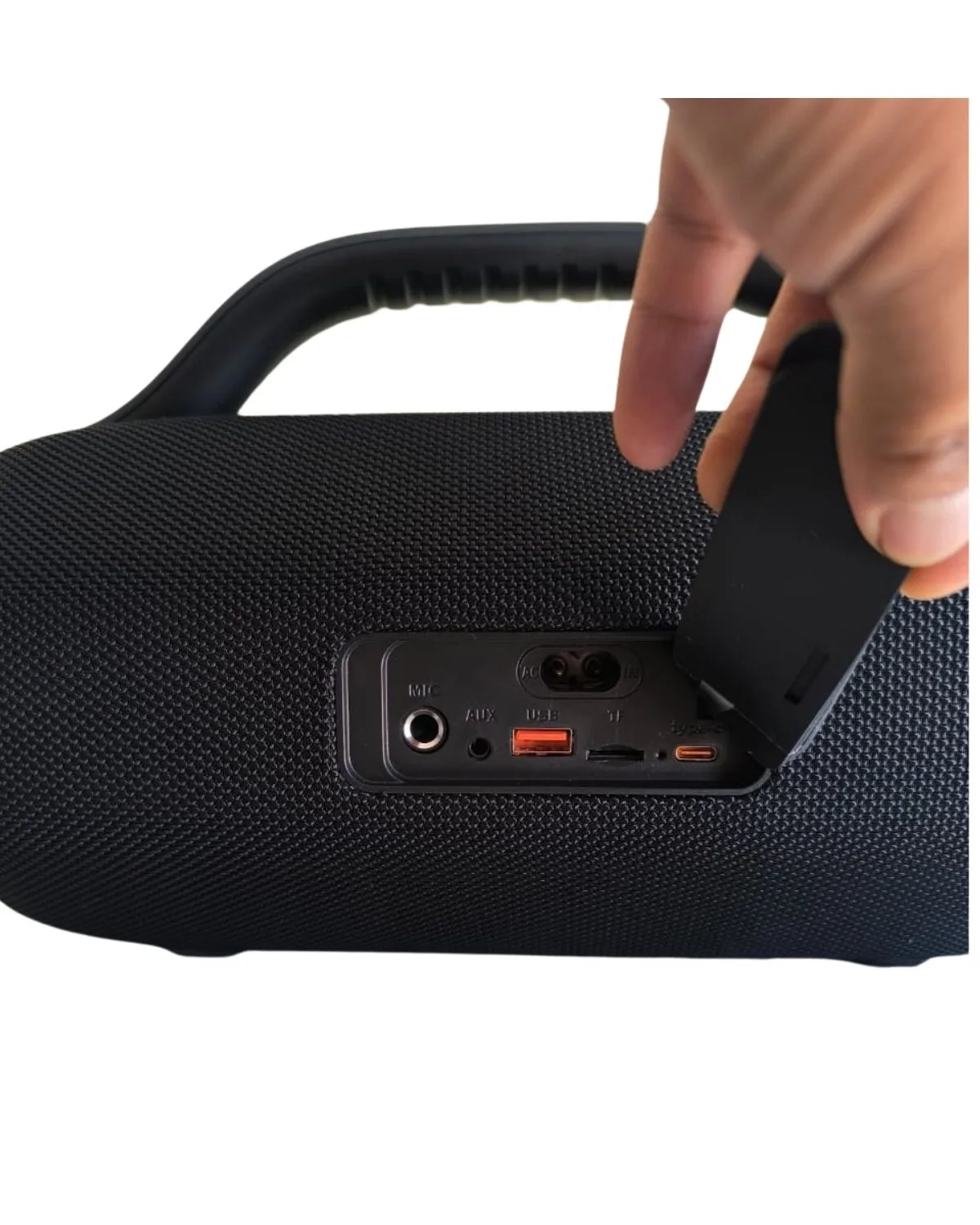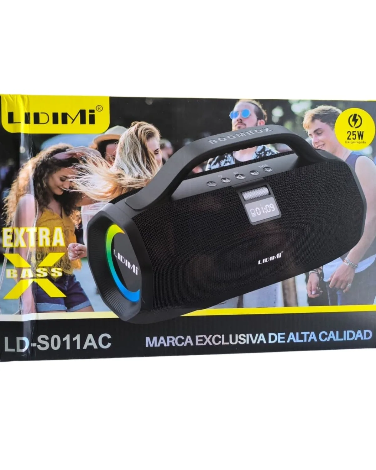 - Diseño portátil boombox – Asa resistente, pantalla LED (muestra hora/modo), cuerpo negro robusto con detalles premium.